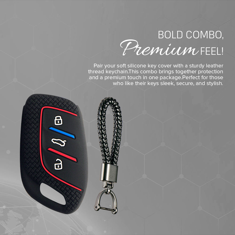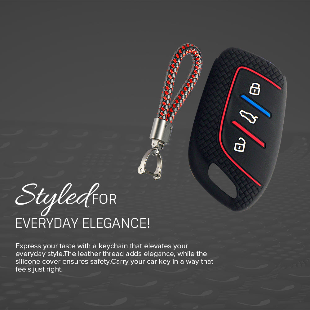 Keycare Silicone Key Cover and keychain Fit for MG : MG ZS EV, Astor 3 Button Smart Key (KC65, Leather Thread Keychain)