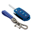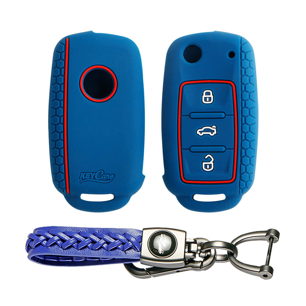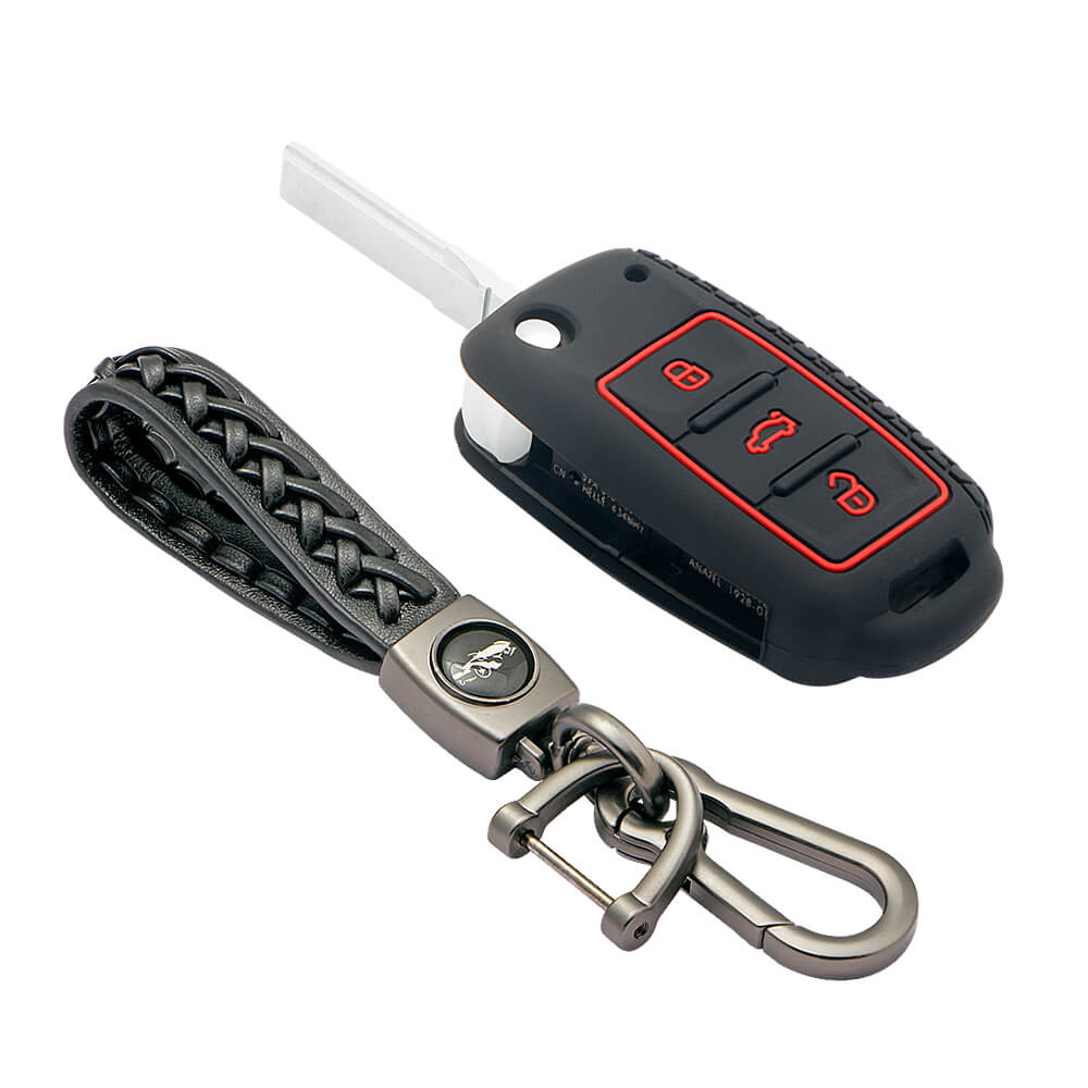 Keycare silicone key cover and keyring fit for : Octavia (Old), Fabia, Laura, Rapid, Superb, Yeti 3 button flip key (KC-13, Leather Woven Keychain)