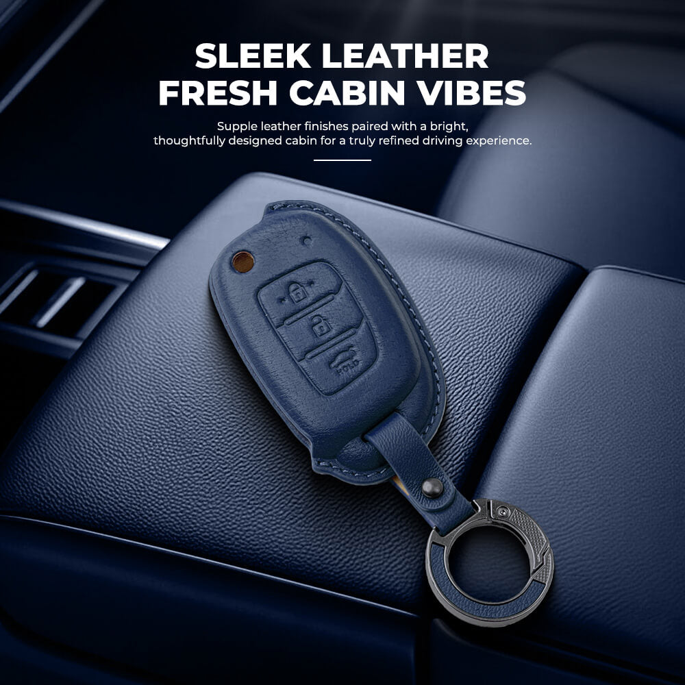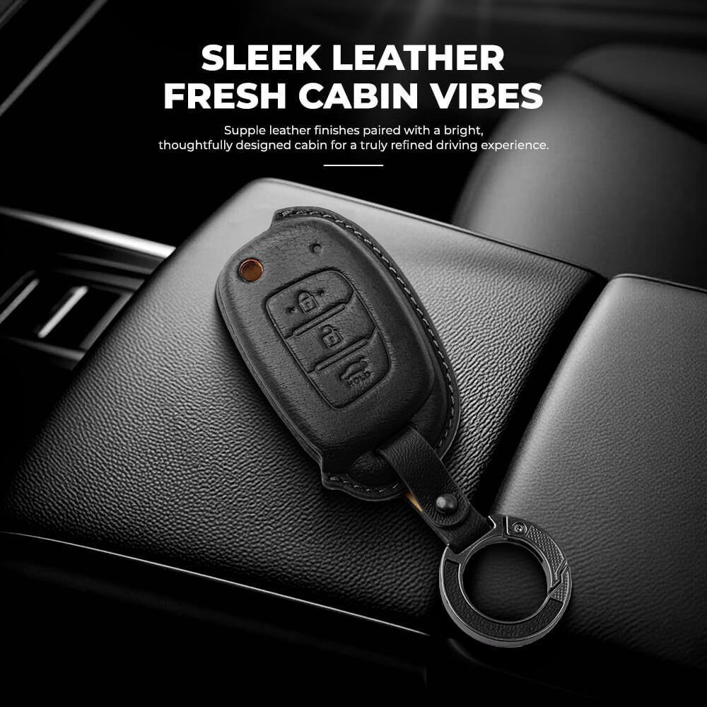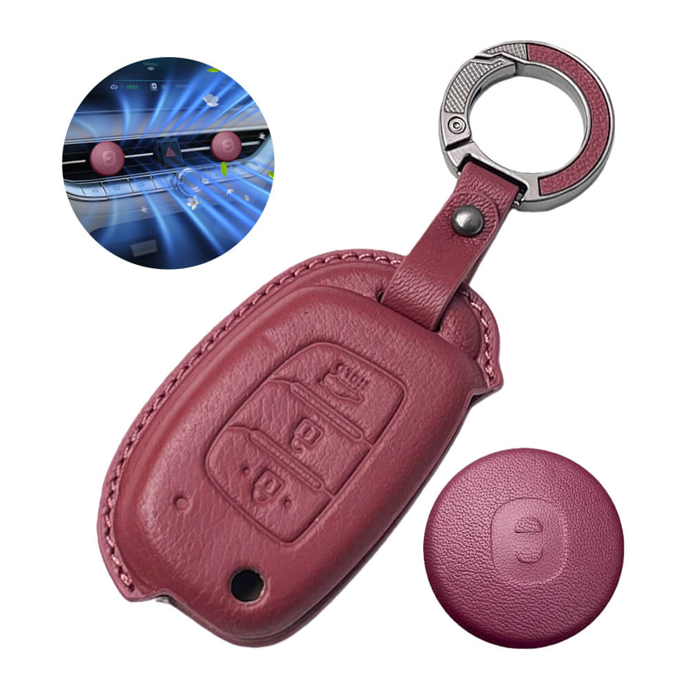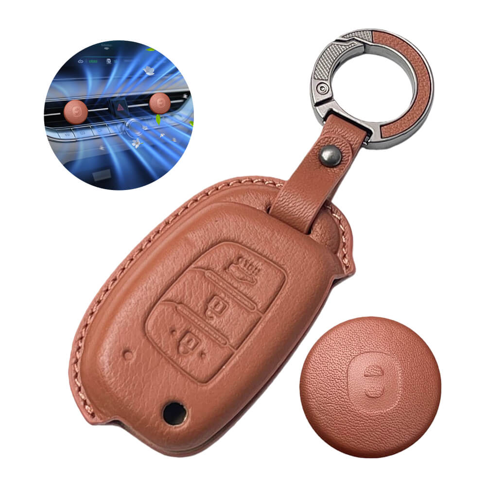 Keyzone Leather Key Cover & AC Vent Car Perfume with 4 fragrances for Hyundai i20, Creta, Venue, Tucson, Alcazar, Grand I10, Aura, Xcent, Exter 3 button flip key(PK10)