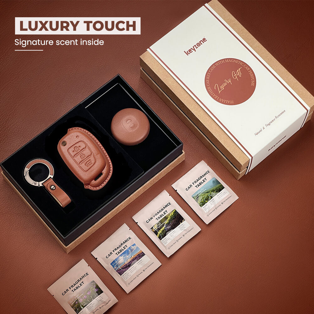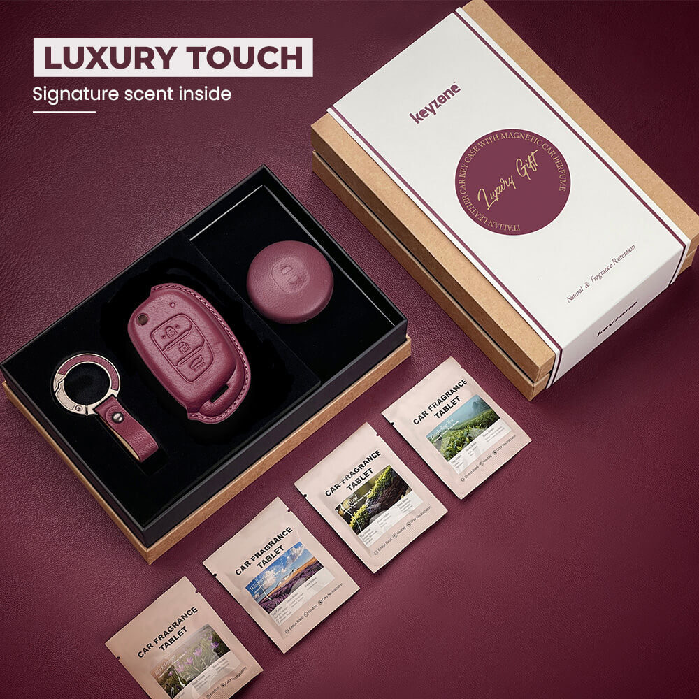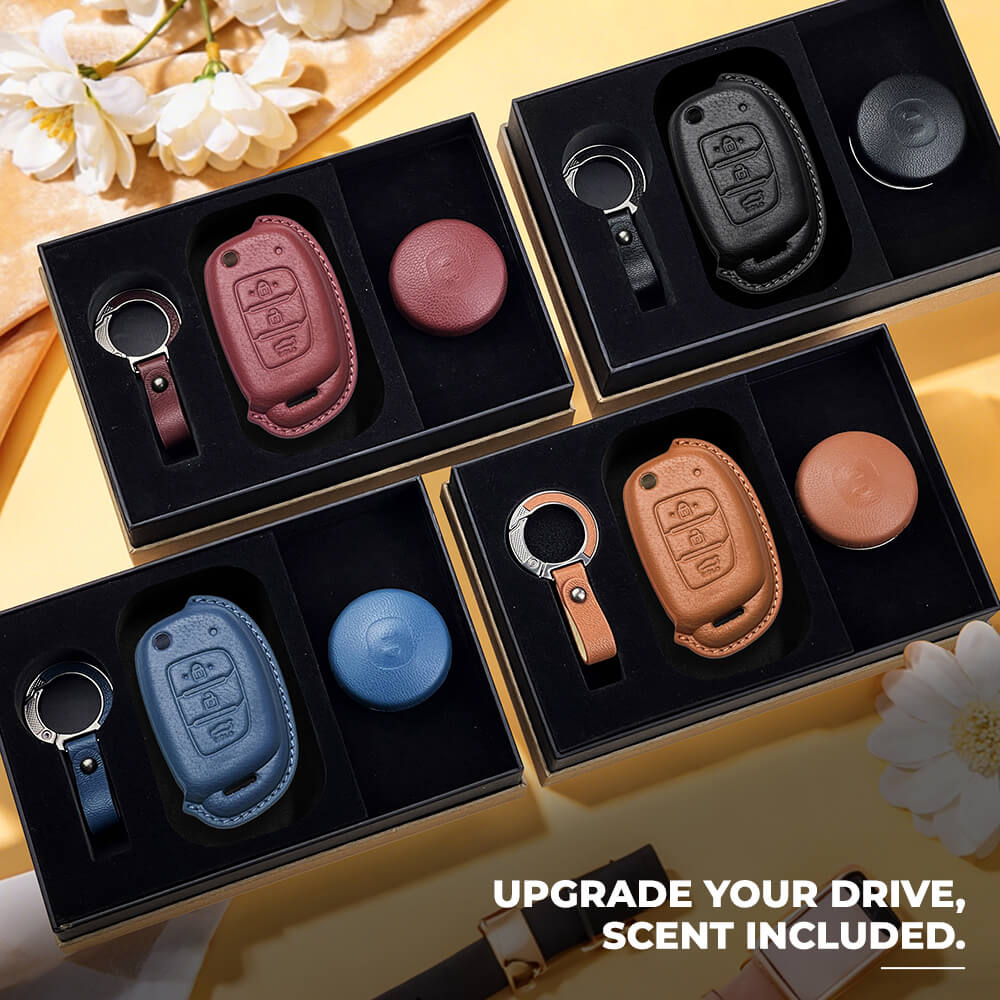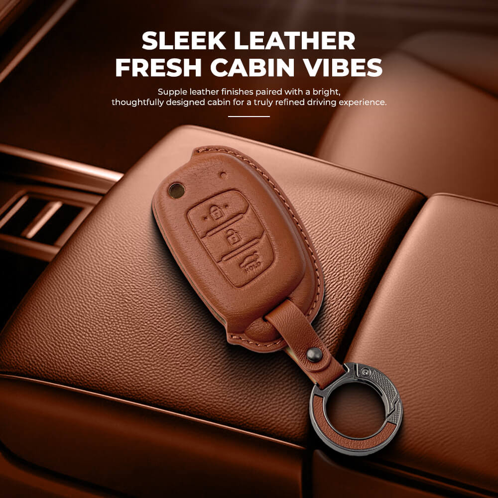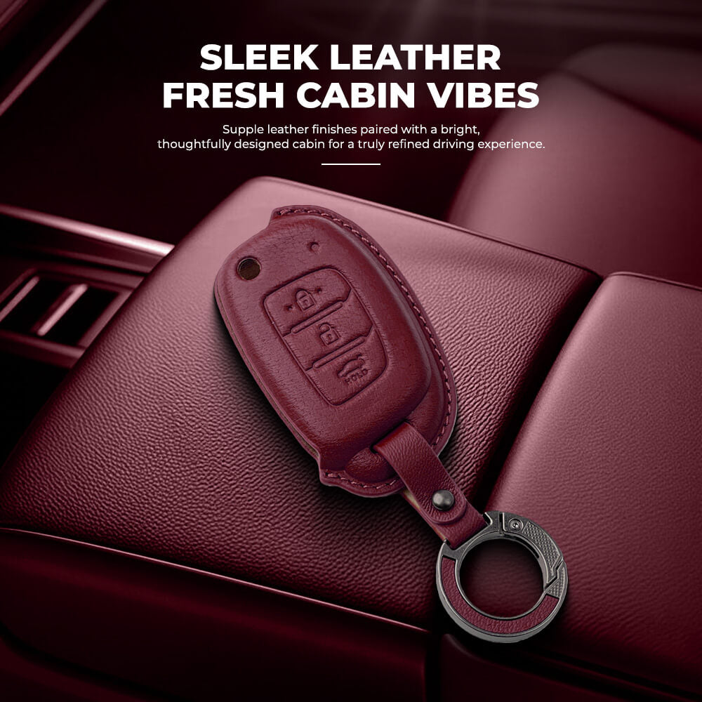 Keyzone Leather Key Cover & AC Vent Car Perfume with 4 fragrances for Hyundai i20, Creta, Venue, Tucson, Alcazar, Grand I10, Aura, Xcent, Exter 3 button flip key(PK10)