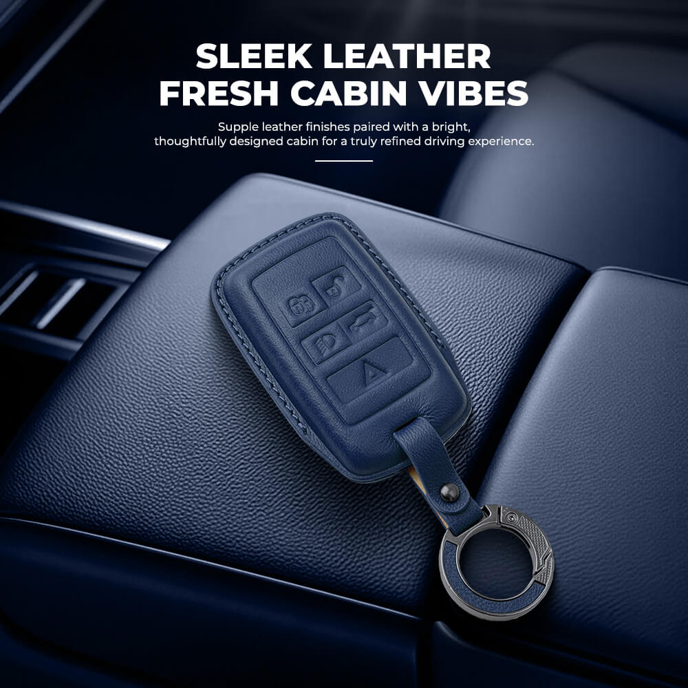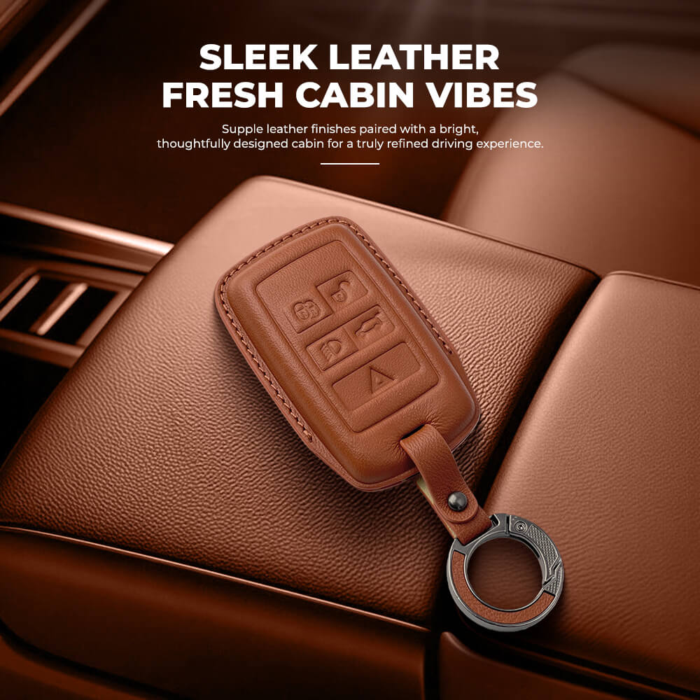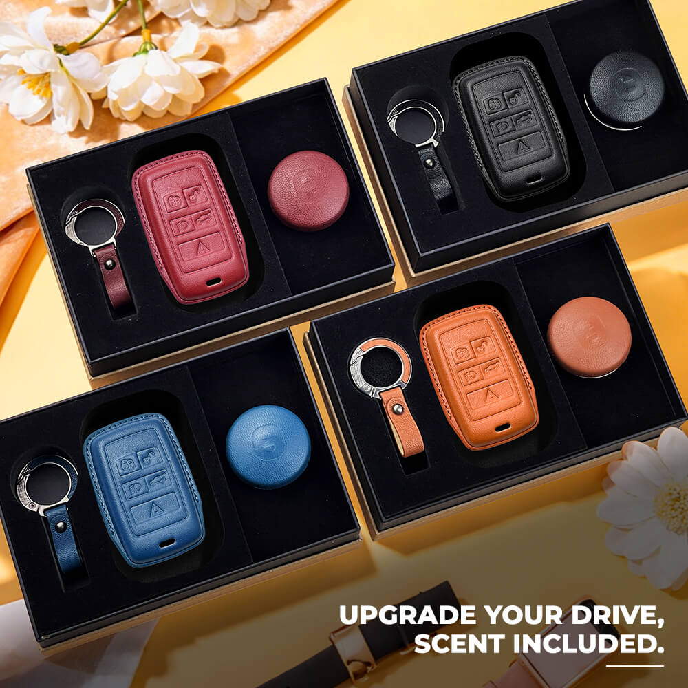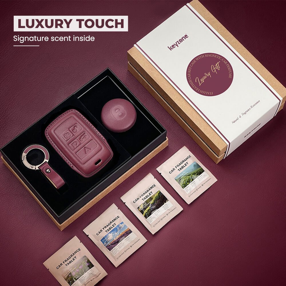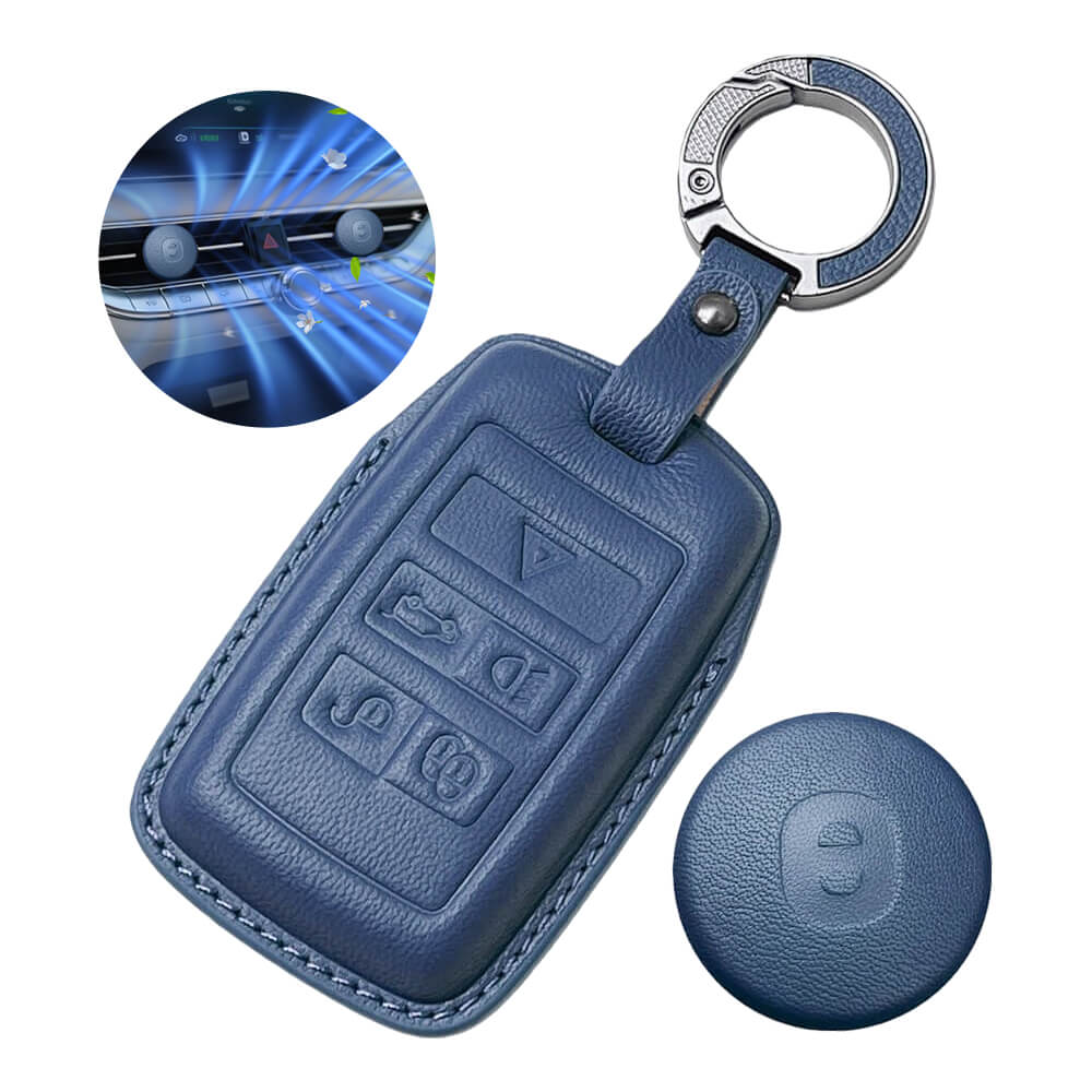 Keyzone Leather Key Cover & AC Vent Car Perfume with 4 fragrances for Jaguar XF XJ XE F-PACE F-Type Range Rover Evoque Velar Discovery LR4 Sport 5 button smart key(PK73)