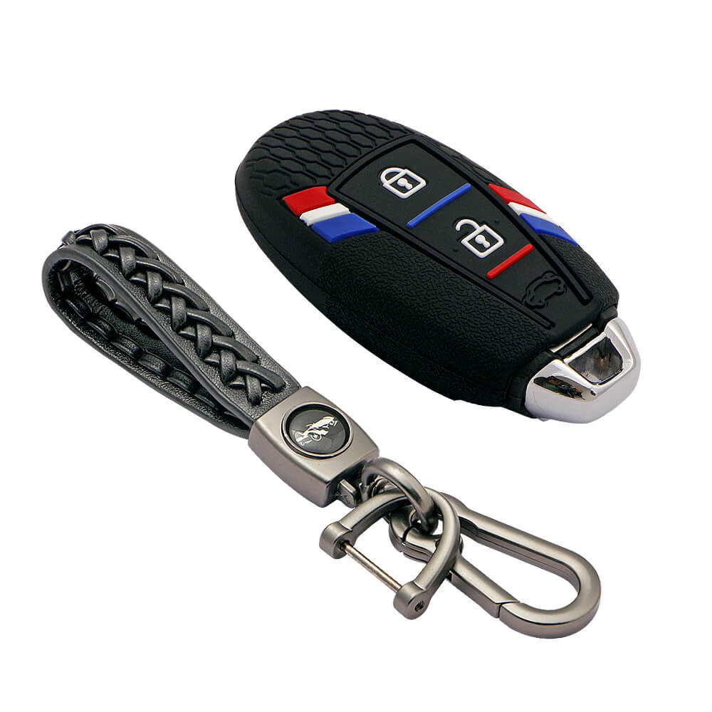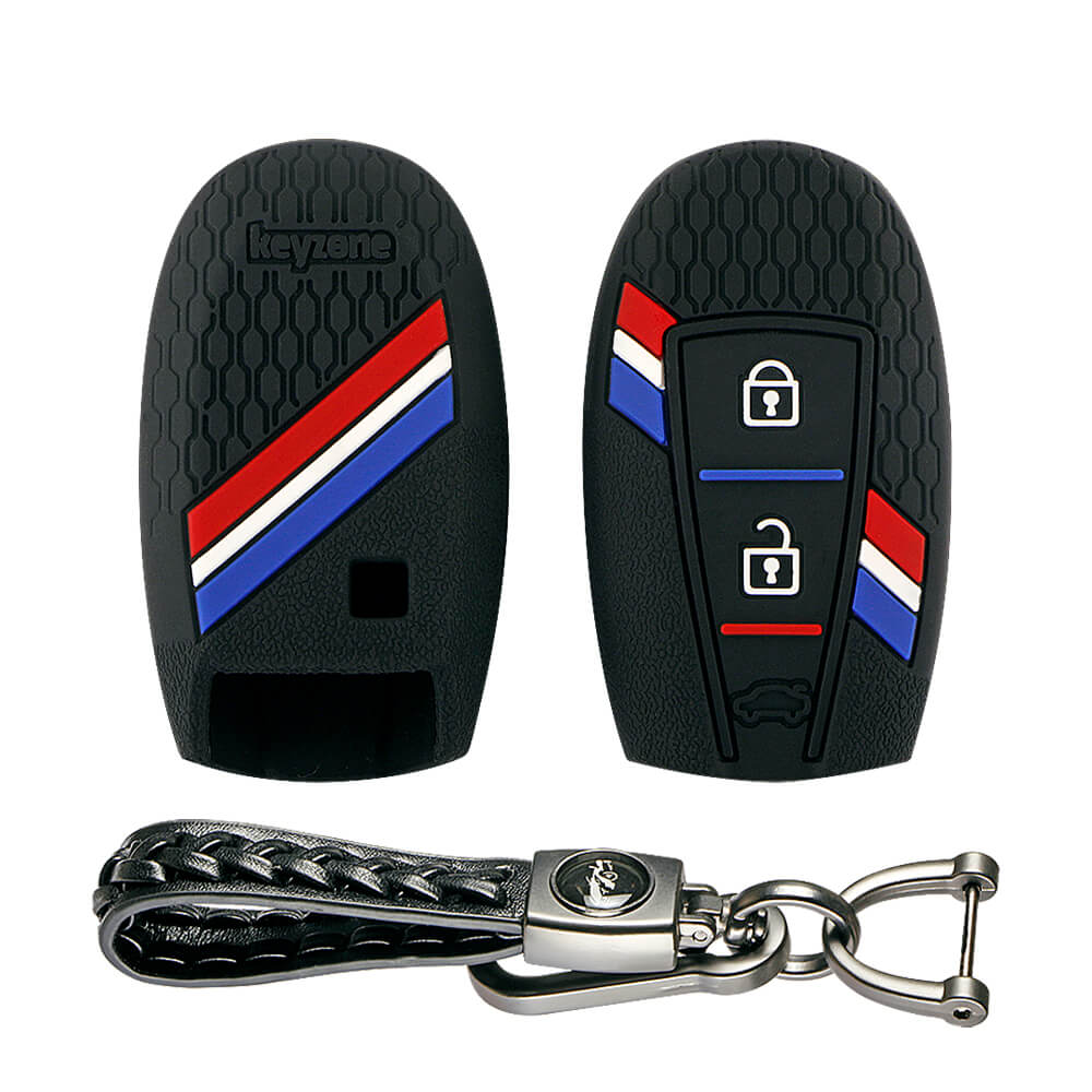 Keyzone striped key cover and keychain fit for : Ciaz, S-cross, Vitara Brezza, Ignis, Swift, Ertiga 3b smart key (KZS-12, Leather Woven Keychain)