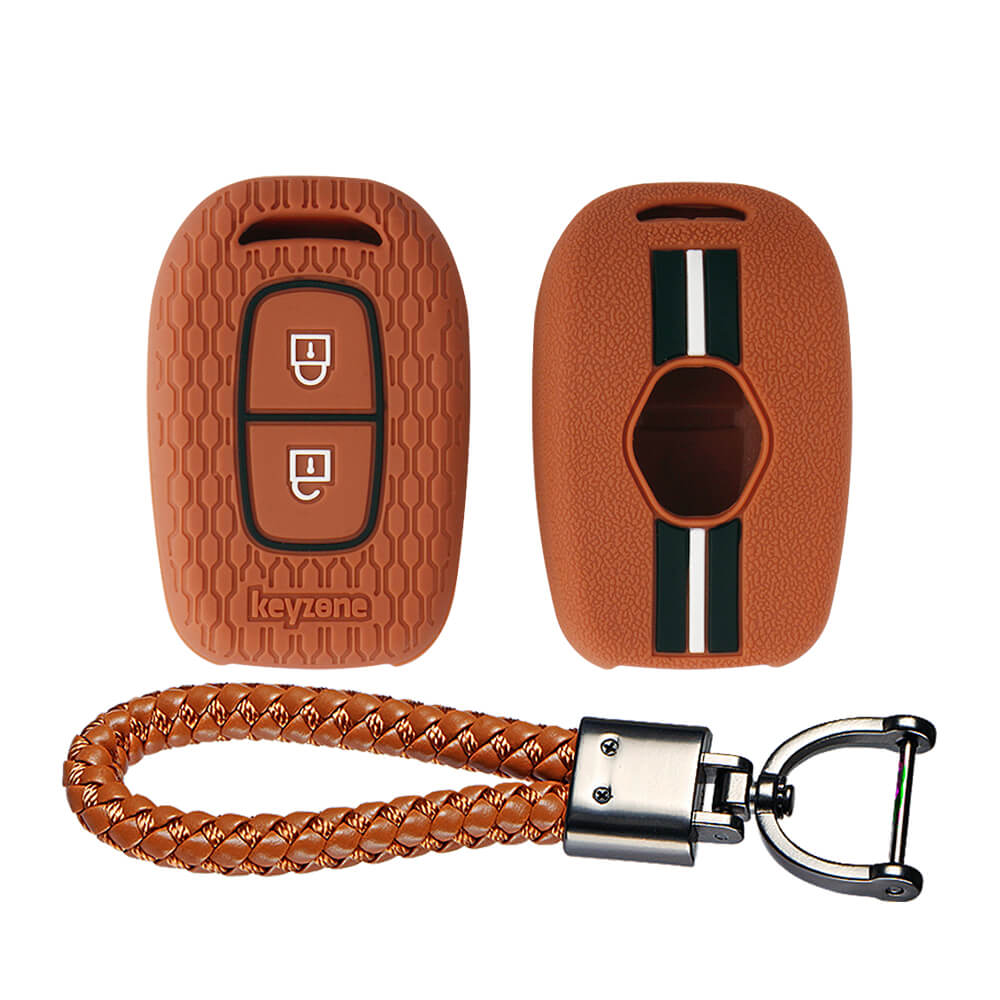 Keyzone striped key cover and keychain fit for : Kwid, Duster, Triber, Kiger remote key (KZS-07, Leather Thread keychain))