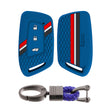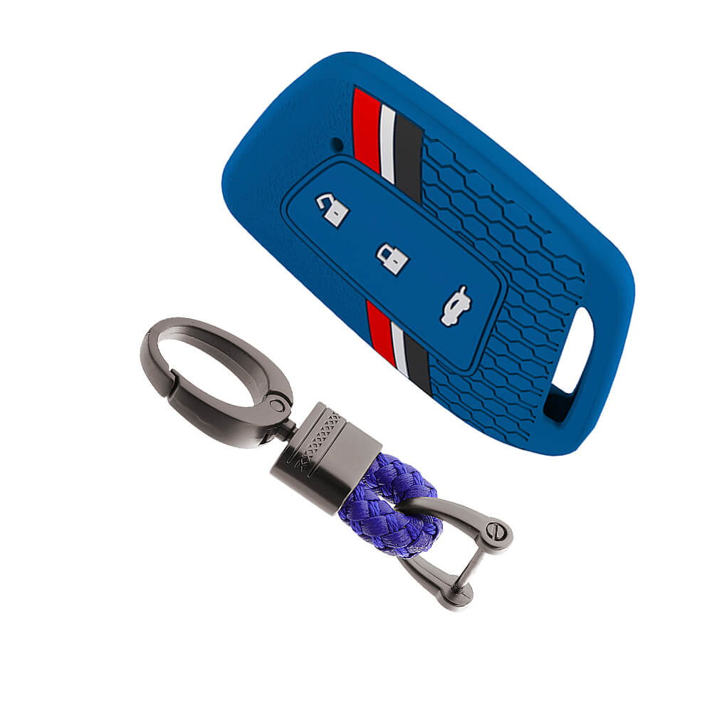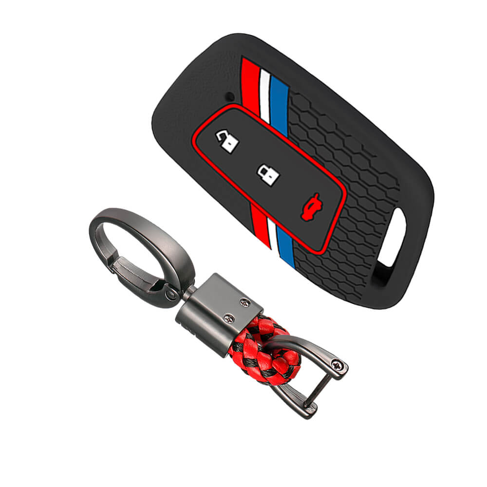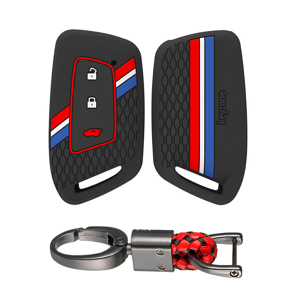 Keyzone striped silicone key cover & keychain for MG Hector, Windsor EV 3 button smart key (KZS-24, Alloy Keychain)