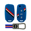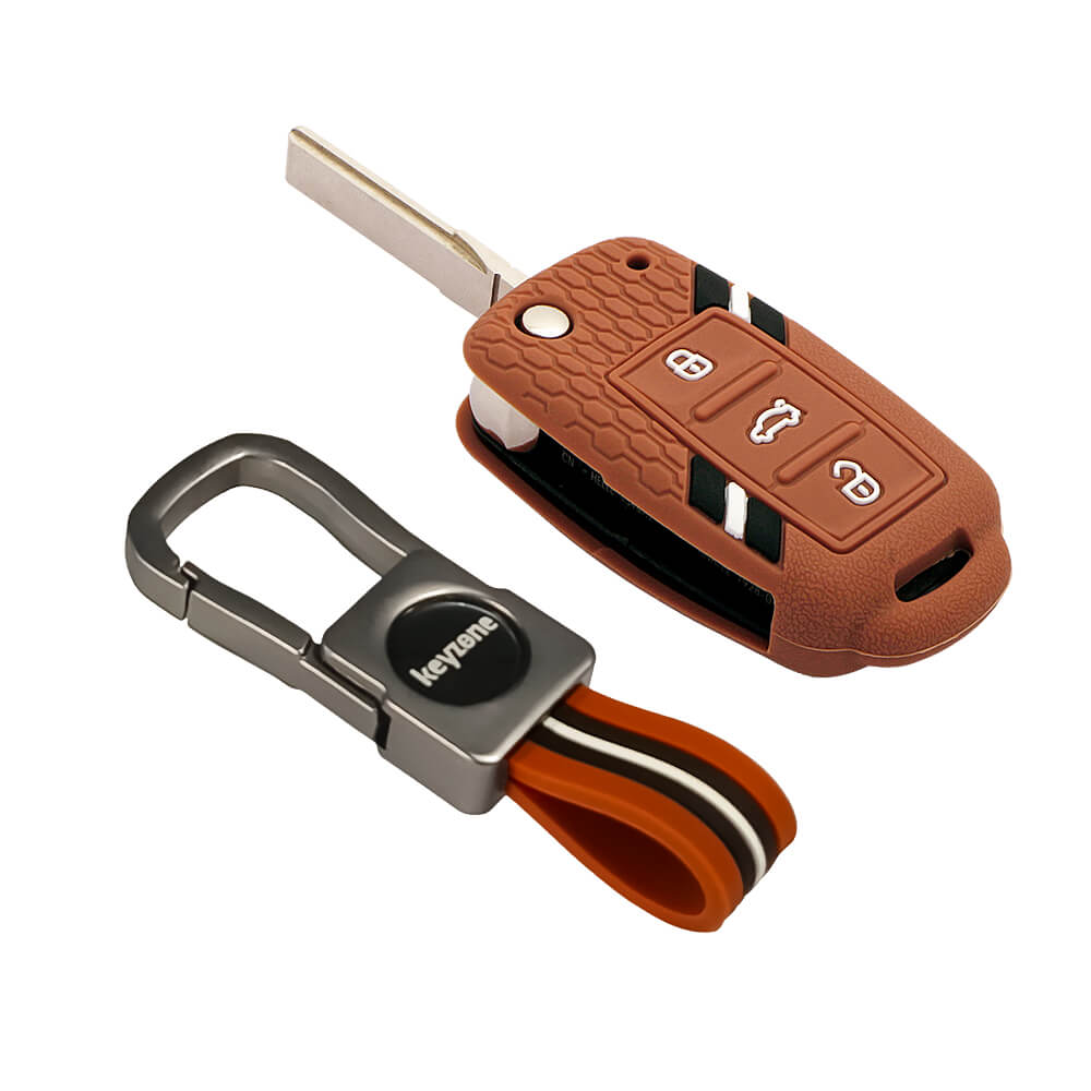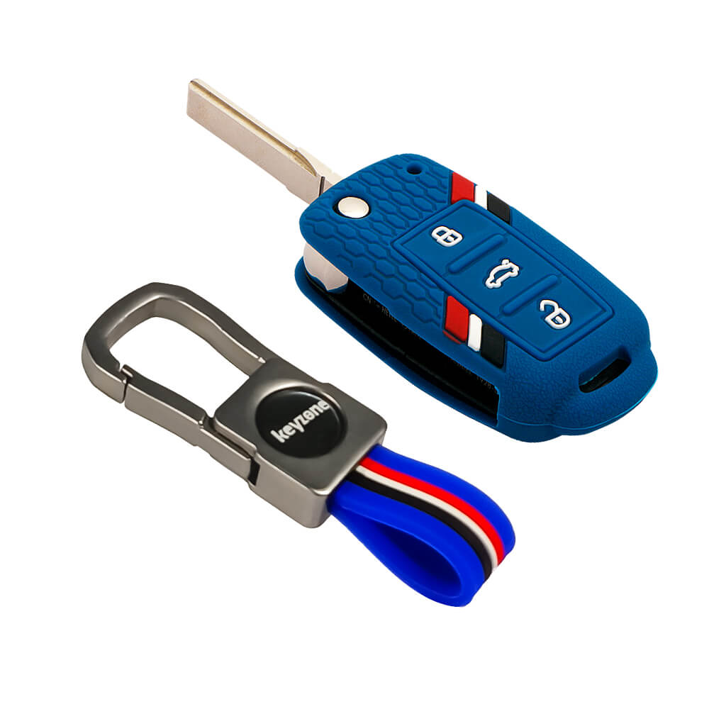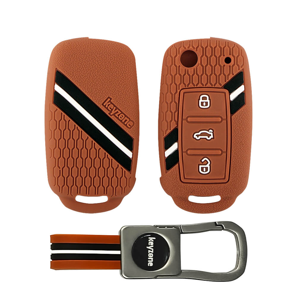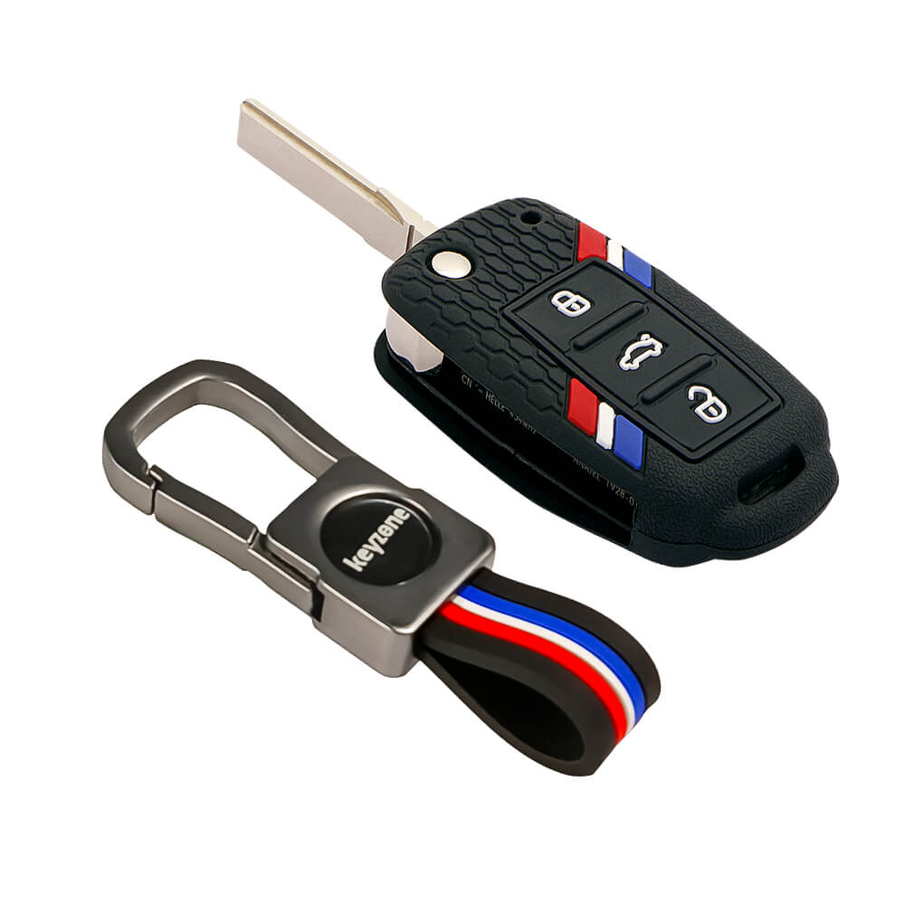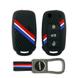 Keyzone striped silicone key cover & metal striped keychain for Fabia Octavia Laura Superb Rapid Yeti Polo Vento Jetta Ameo 3 button flip Key(KZS-11,KZMTKC)