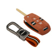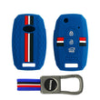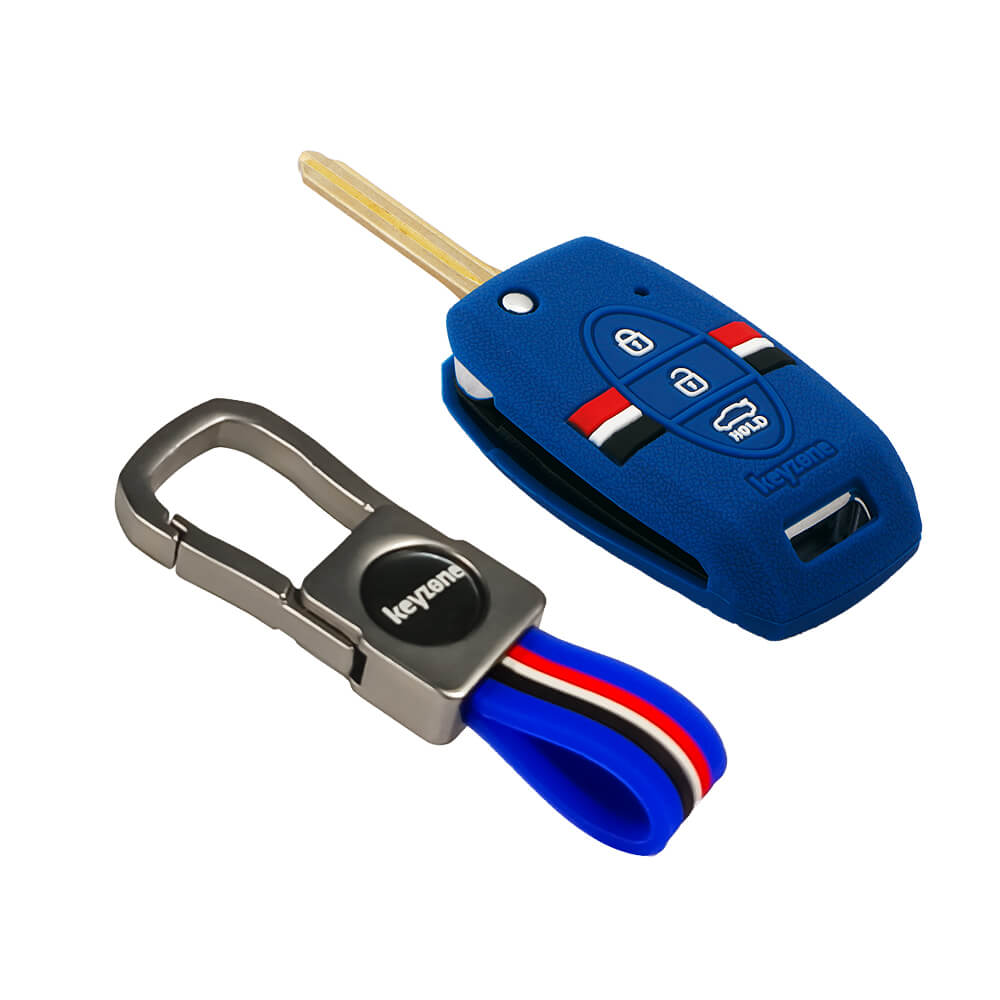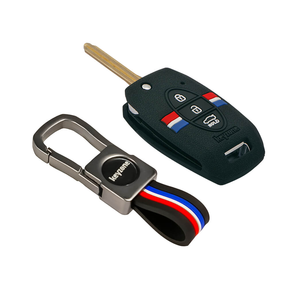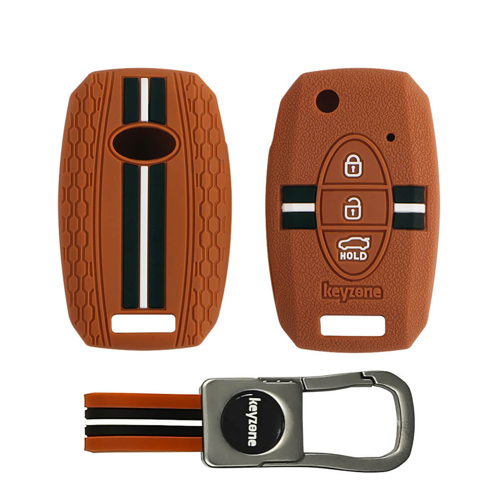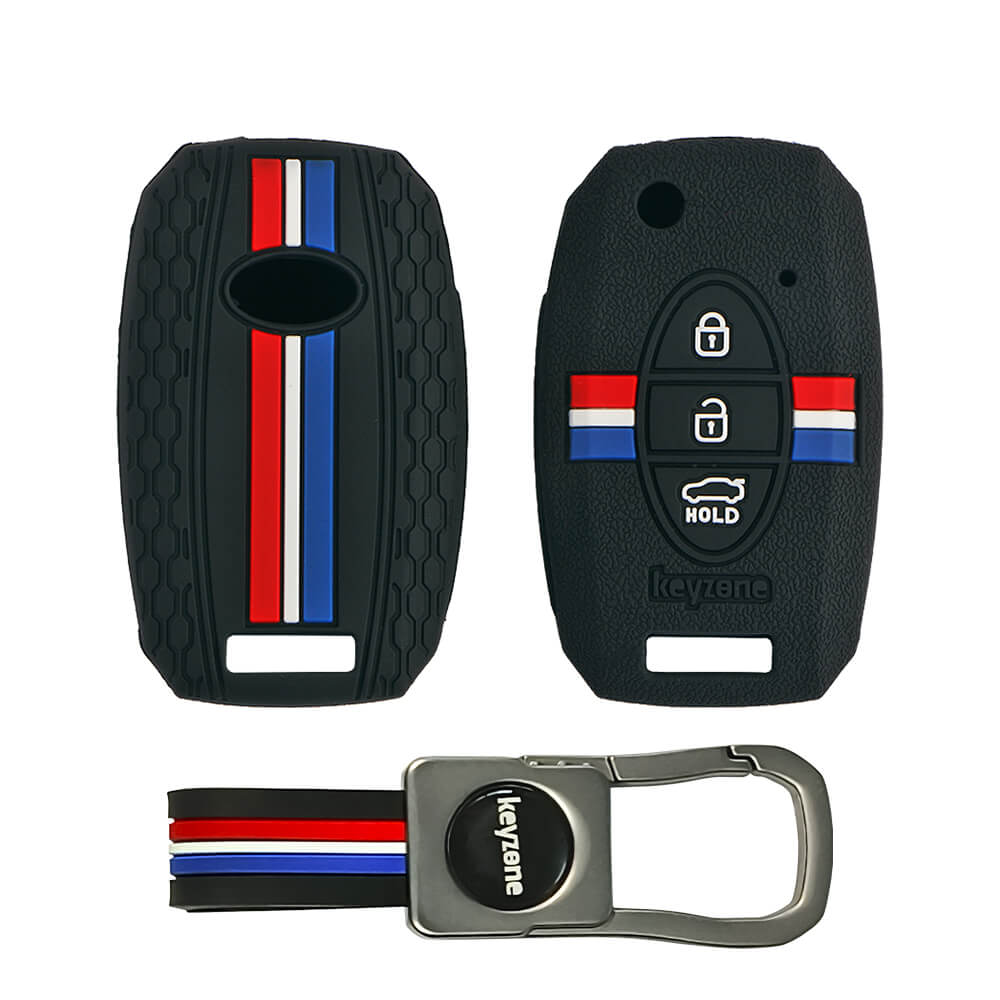 Keyzone striped silicone key cover & metal striped keychain for Kia Seltos, Sonet, Carens 3 Button flip Key (KZS-08,KZMTKC)