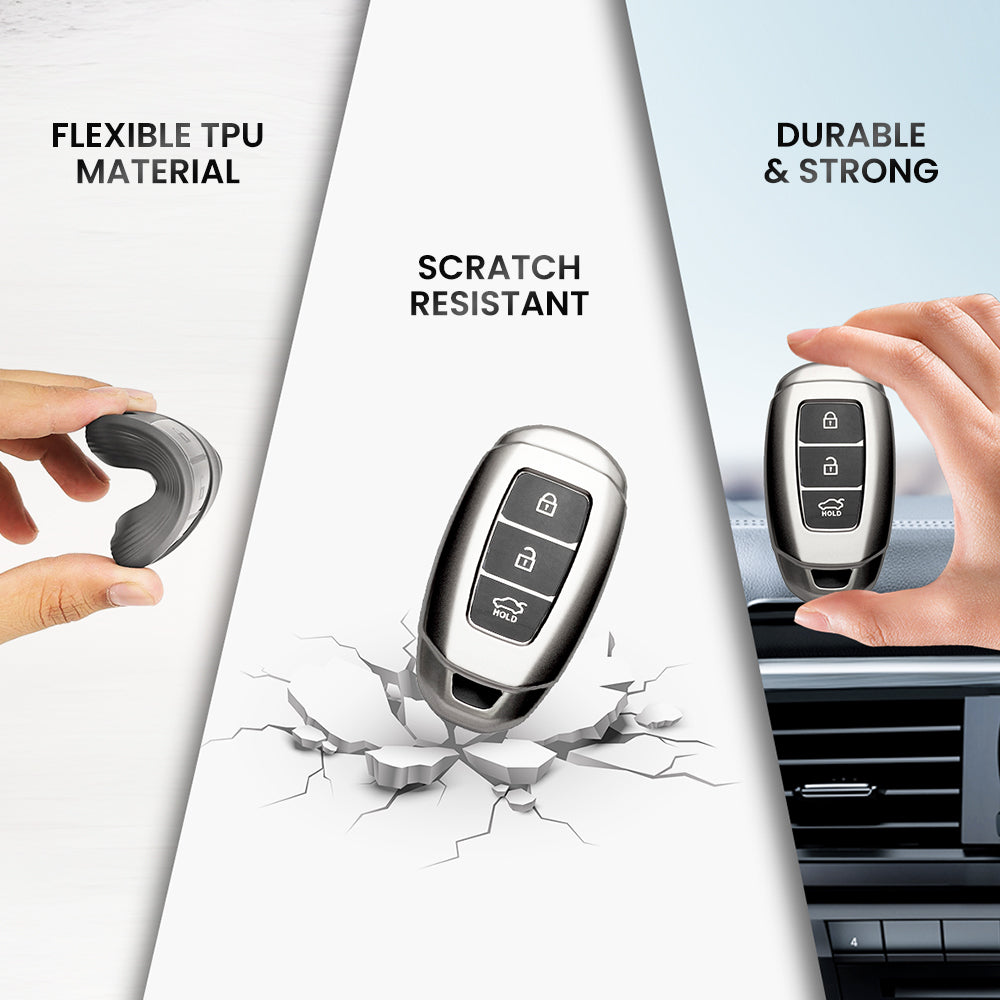MARIRAJ S Keyzone TPU car Key Cover & metal alloy key holder for Hyundai i20, Verna, Kona 3 Button Smart Key (GMTP41, MAH KeyHolder)
